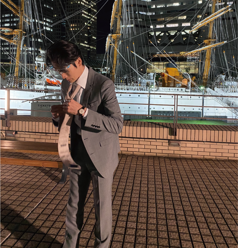 この日は横浜の公園でのナイトロケ。シーンが変わり、いつものようにネクタイをチェンジする洸平さん。