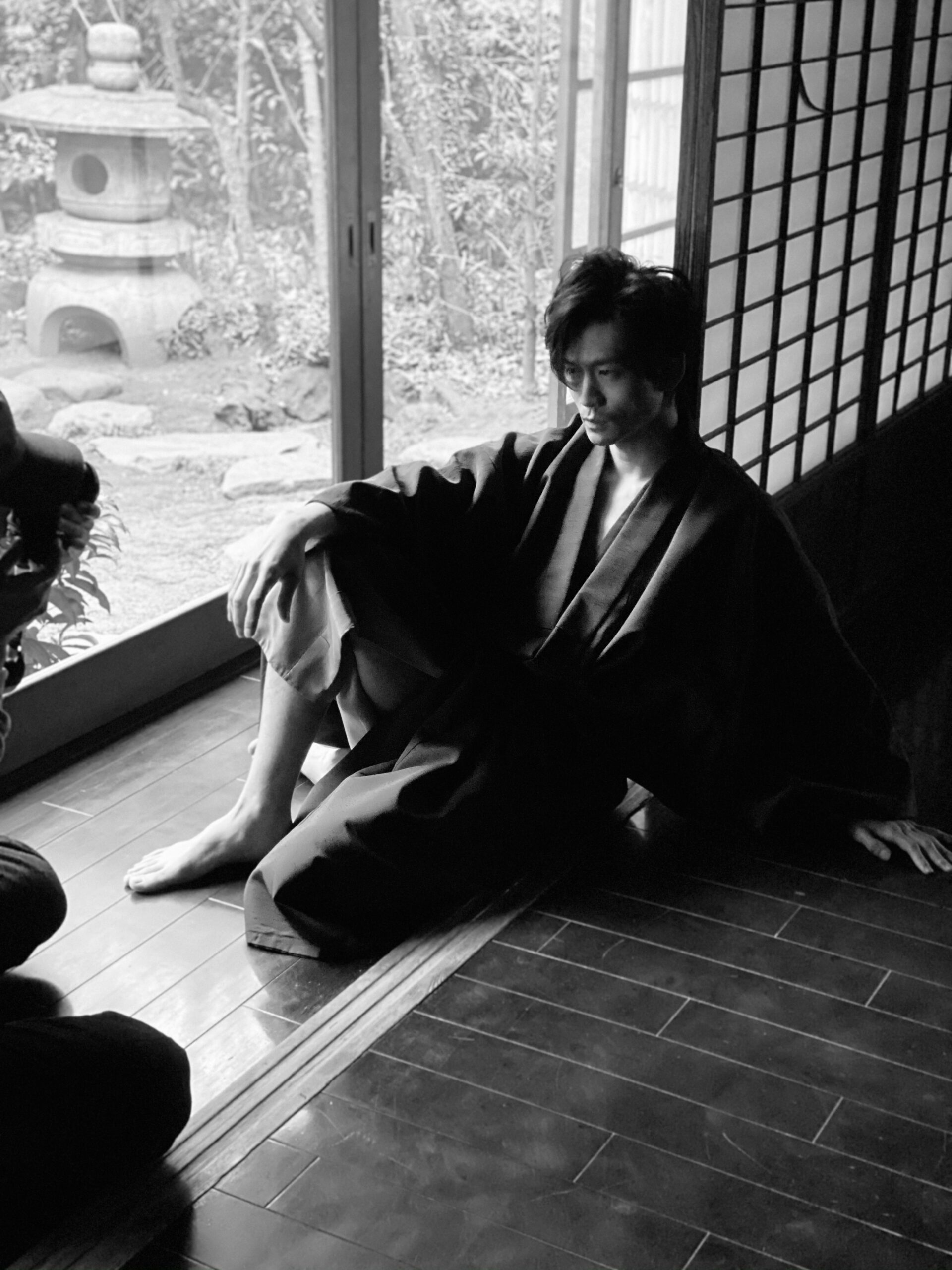 洸平さんは自堕落な文豪風イメージで都内の古民家にて撮影してきました。着物と古民家の組み合わせで雰囲気バッチリ。スタッフもついつい感化されて、普段はしない白黒で撮ってみたら、なんとなくいい感じ?