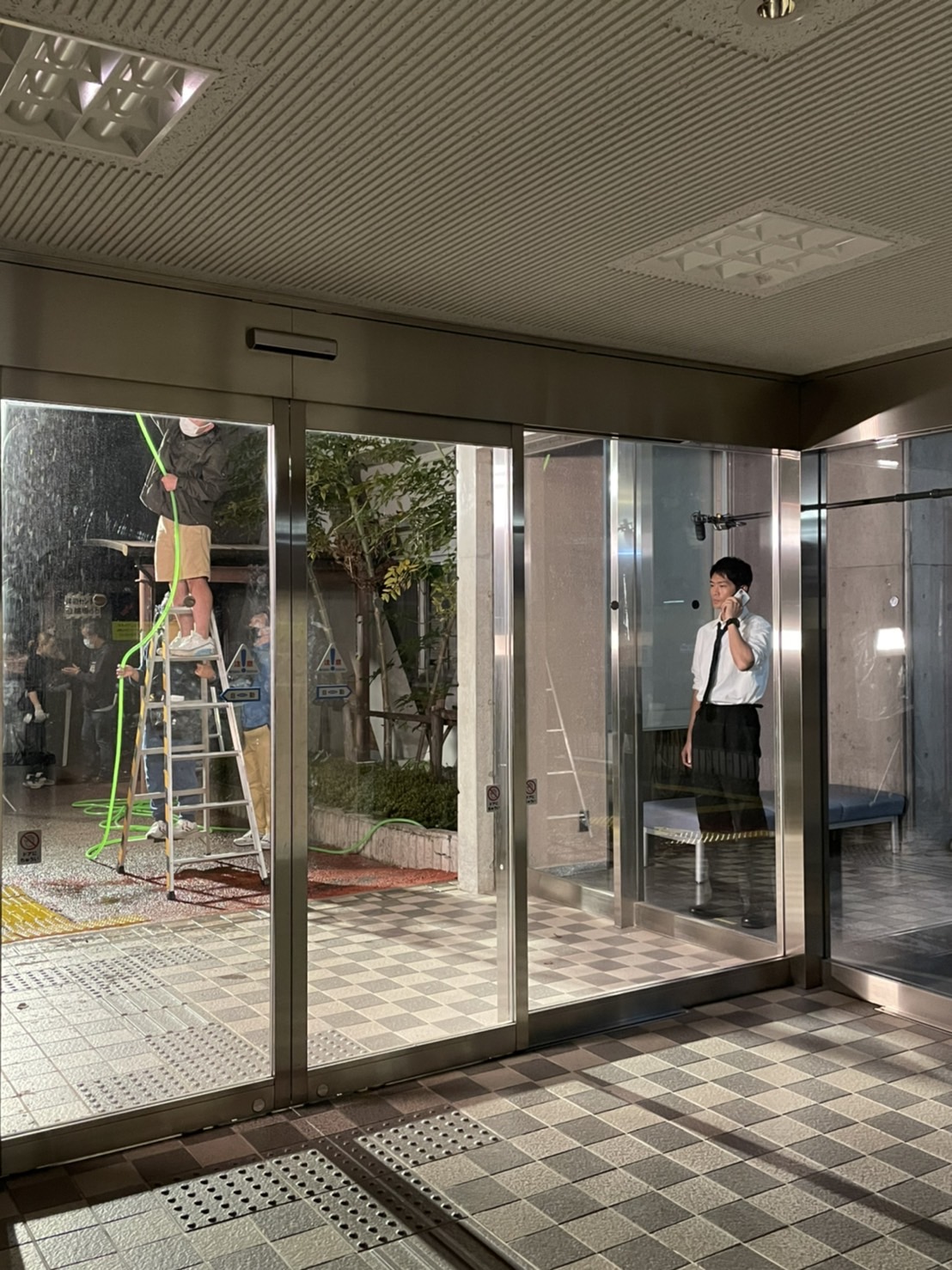 窓越しの雨が印象的なシーンでしたが、もちろんあの雨は自然な雨ではなく、演出上降らした雨でした。実際の撮影ではスタッフさんが雨ガッパを着てホースで水を撒いてくれていました。