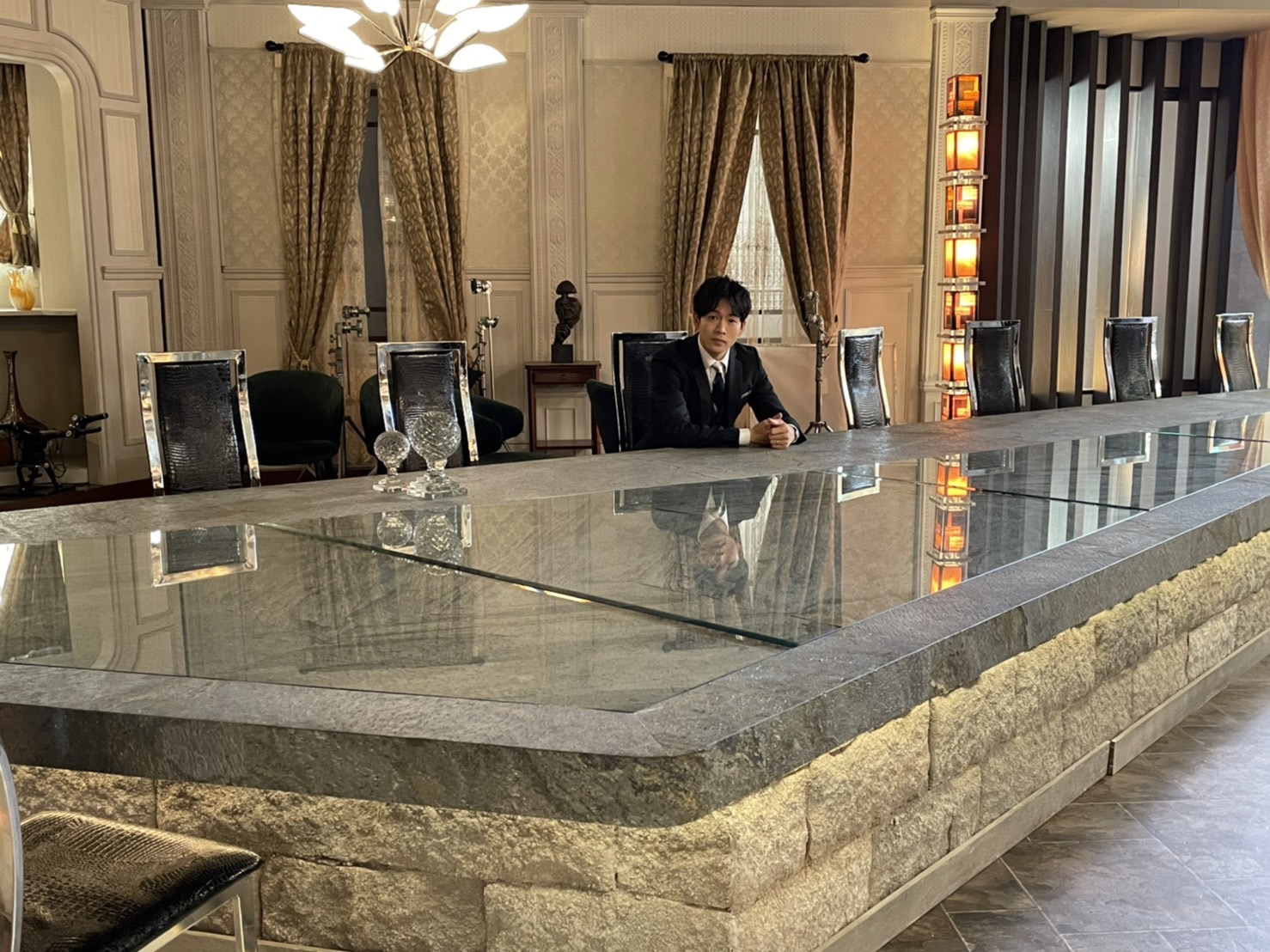 普通の家庭なら文字通り“食卓を囲む“ということでテーブルを囲むように座りますが、さすが深山家。