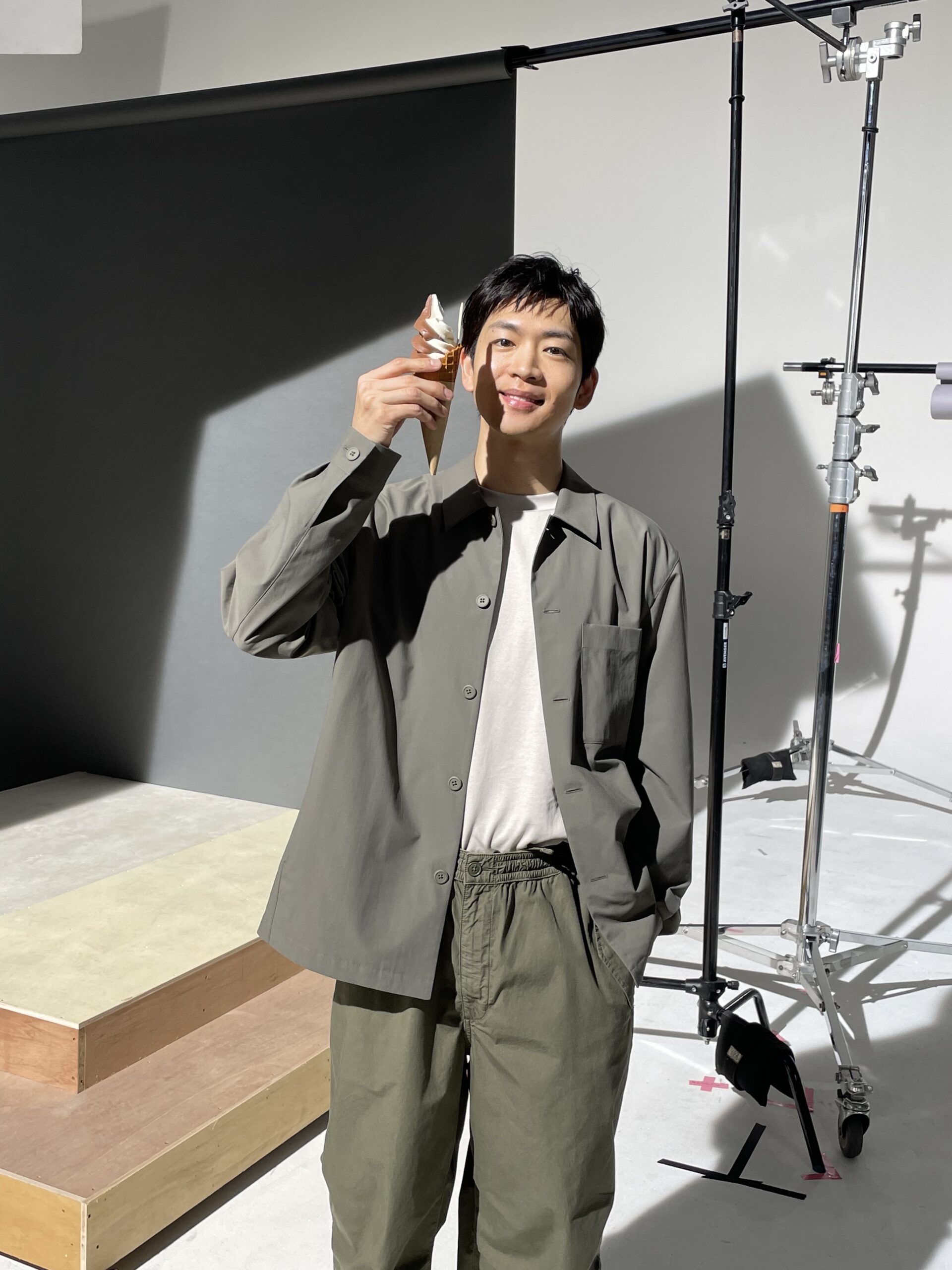 # 撮影用のパラシュートパンツやジャケットを着たまま、実に嬉しそうにソフトクリームを高々と掲げている洸平さん。