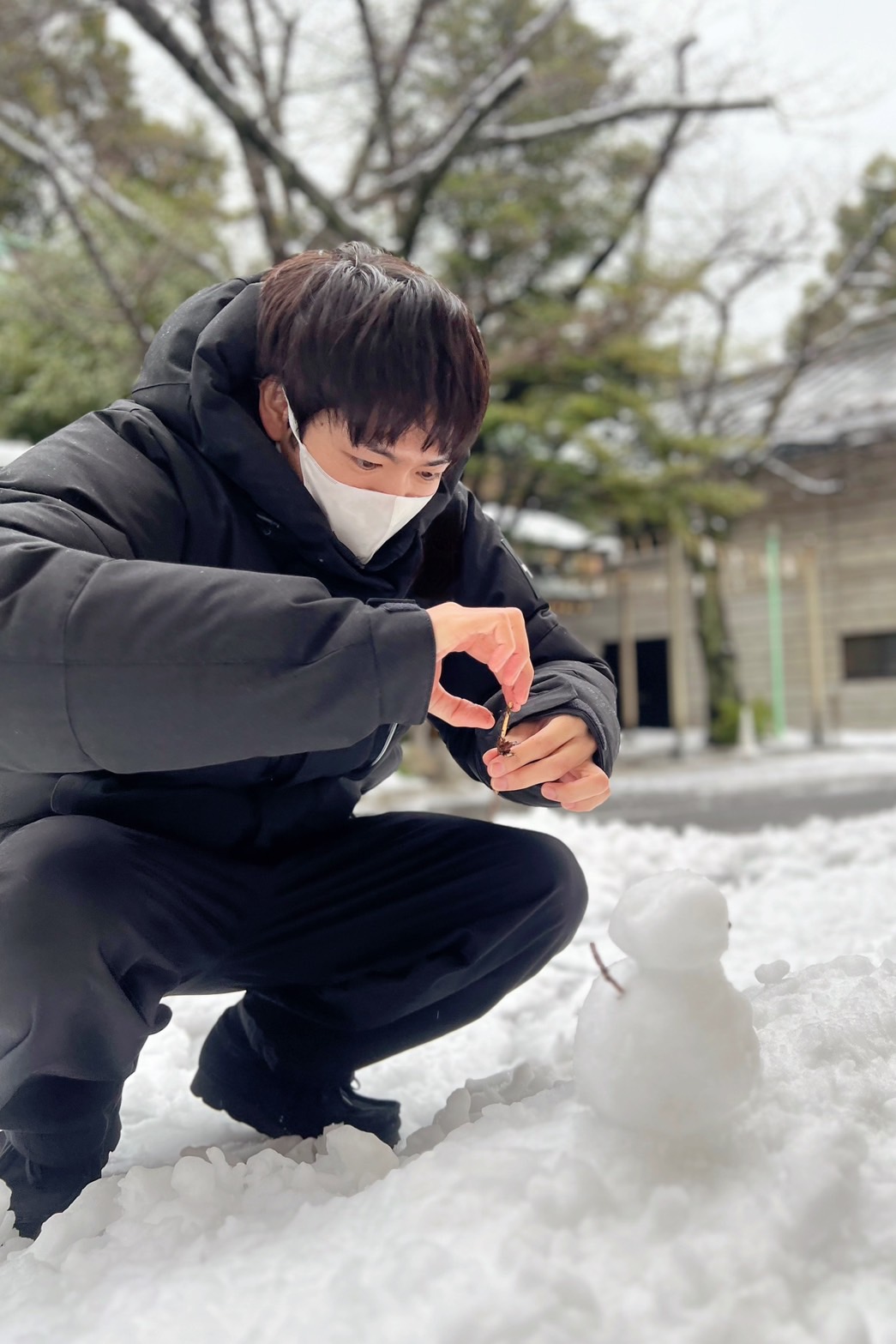 # 「いい感じのカーブの枝を見つけた」と真剣に2つの雪の玉に飾りつけておりました。